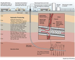 Fracking involves drilling more than a mile down and more than a mile horizontally into a shale layer. Millions of gallons of water, sand, and chemicals are injected, and small fissures in the shale that are filled with liquid methane (natural gas) are fractured under the increased pressure. The concoction, laden with liquid natural gas, amongst toxic chemicals like arsenic and barium, is brought to the surface and placed in holding ponds or tanks to await truck or pipeline transport to a facility for separation of natural gas.