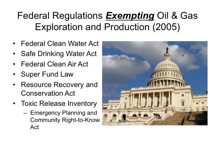 | Exemptions for the fracking industry created by the Halliburton Loophole. |