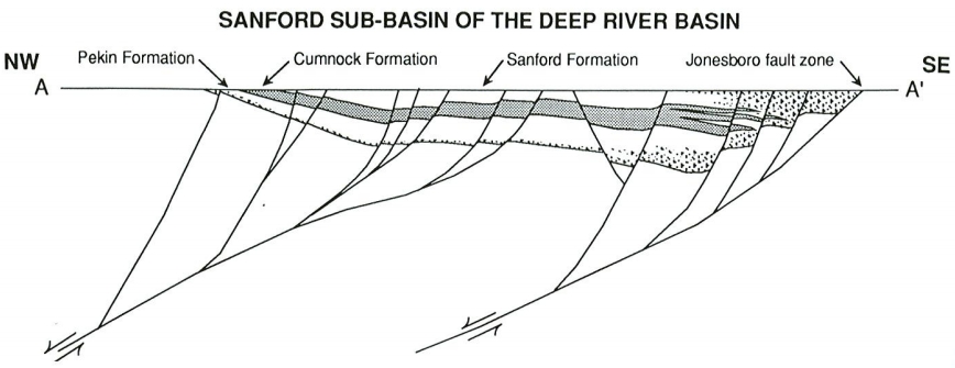 GEOLOGY:  The target layer for fracking in North Carolina is a black shale that lies within what is known as the Triassic Basin—methane deposits across the US are most frequently found in shale layers.  In NC, the shale layer is shallow and completely exposed near Durham, then dips to depths less than 3,000 ft towards the southwest.  Compare this to the Marcellus Shale in Pennsylvania, which is over 1-mile deep (>5,280 ft).  Although shallower deposits do make it easier to frack, NC deposits are very close to aquifers and will likely solicit concern from residents (in contrast to PA, where the shale is much deeper than groundwater aquifers, but negative fracking–aquifer interactions still occur).