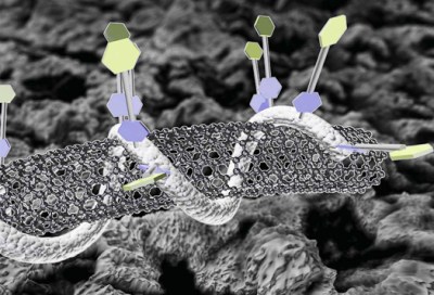| A conceptual image of DNA attaching to a carbon nanotube as a biosensor to detect drug effectiveness (source: http://www.futurity.org/science-technology/fuse-dna-nanotubes-for-better-biosensors/) |