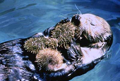 Despite this amazing growth rate, kelp can be decimated into “sea urchin barrens” (former kelp forests where sea urchins cover the substrate) in the absence of sea otters. Sea otters eat invertebrates and small fish, but most importantly to kelp, sea urchins. Sea urchins are herbivorous and can clear-cut a kelp forest quickly and with relative ease by scraping the base of the kelp off the sea floor. Without the pressure of sea otters to control the population of sea urchins, kelp forests and the habitat they provide to fishes can be destroyed.