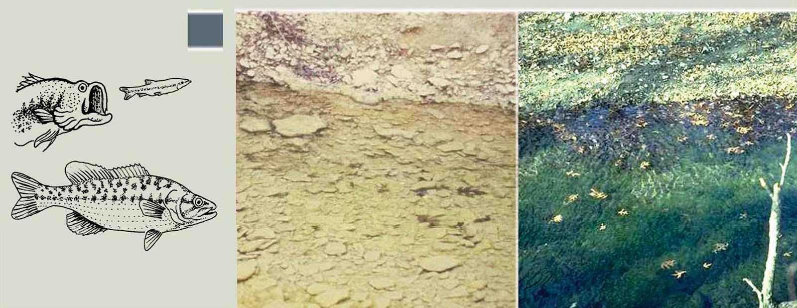 | Landscape level affects of a trophic cascade. Pools in Brier Creek, a prairie margin stream in south-central Oklahoma with (right) and lacking (left) largemouth and spotted bass. The predatory bass extirpate herbivorous minnows, promoting the growth of benthic algae (Power et al. 1985). Source: Estes et al. 2011. |