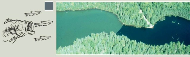 | Landscape level affects of a trophic cascade. Long Lake (Michigan) with largemouth bass present (right) and experimentally removed (left). Bass indirectly reduce phytoplankton (thereby increasing water clarity) by limiting smaller zooplanktivorous fishes, thus causing zooplankton to increase and phytoplankton to decline (Carpenter et al. 2001). Source: Estes et al. 2011. |