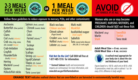 | Recommendations from Washington Department of Health. Source: http://www.doh.wa.gov/CommunityandEnvironment/Food/Fish/HealthyFishGuide.aspx |