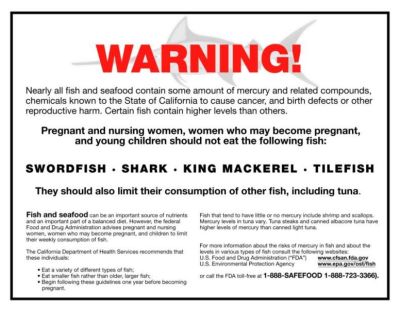 | Sign warning fish consumers about the risks of mercury from California. Source: http://www.electricbluefishing.com/eb_sub_menu/mercury_in_fish__shellfish.htm |