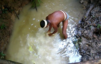 | Fishermen smash barbasco roots with a piece of wood, then dip and shake the smashed roots in the water, releasing rotenone. Poisoned fish come to the surface, easy to take with a net. Source: http://amazon-explorer.blogspot.com/2012_08_01_archive.html |
