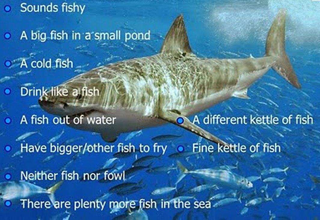 Some examples of fish idioms. Source: http://aclil2climb.blogspot.com/2011/03/idioms-part-19-food-fish-interactive.html