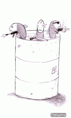 A play on the idiom, shooting fish in a barrel. Source: http://www.matazone.co.uk/sillyimages/blog/shooting-fish-in-a-barrel.html