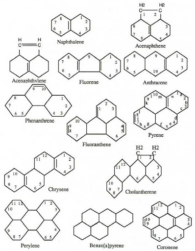| A few different PAHs. Historically, PAHs with more rings are considered more carcinogenic. Source: http://www.env.gov.bc.ca/wat/wq/BCguidelines/pahs/pahs-01.htm |