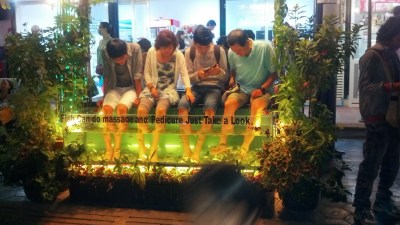 Laughing at myself and this outrageous mental image, my eyes wandered downward to a large fish tank surrounded by a wooden bench. I peered into the water, and it was teeming with small fish. Sitting on the bench were four people, their pant cuffs rolled up to their knees on their glowing legs that dangle in the water, watching amused as hundreds of fish pecked at every inch of their submerged skin.