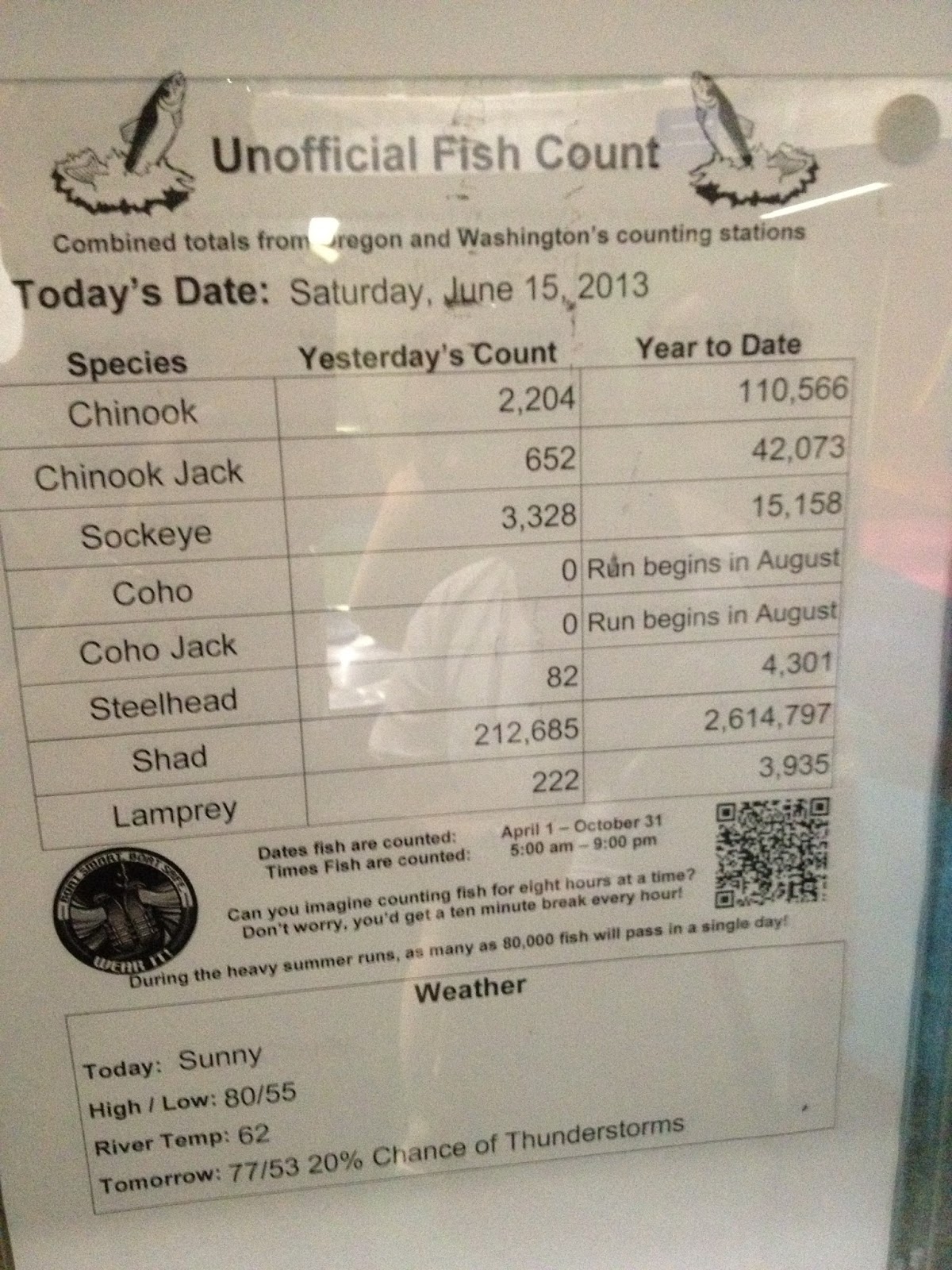 Fast forward to today…literally today. More than 200,000 American shad (direct descendants of those initial 10,000) will swim through the Bonneville Dam fish ladders on the Columbia River today (6/17/2013) in their yearly migration upriver to spawn. These numbers are highly accurate because people are paid to sit in a small underwater room and count fish as they go by a small window (see link at end of story).