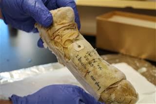 | The earplug from a female bowhead whale extracted in 1964. Analyzing earwax from older samples will help show how contaminant levels have changed in our oceans over time. Source |