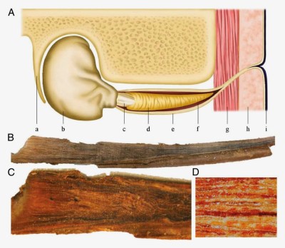 | This diagram shows an earplug in a blue whale skull. The bacon-like image (D) is a close-up of the earplug. Images courtesy Michelle Berman-Kowalewskic, Santa Barbara Museum of Natural History. Source |