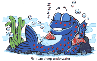 Fish can be insomniacs; well, if researchers modify their biology. Zebrafish (Danio rerio) have been used to study sleep disorders. Researchers monitored the sleep patterns of normal Zebrafish and those that lacked a functional hypocretin brain receptor (which has been linked to narcolepsy in other organisms). The mutant fish fell asleep 30 percent less often than the normal fish and when they did finally catch some zzz’s, they could only sleep half as long as normal fish. Another study with Zebrafish showed that ambient light is very important to sleep duration. But, that sleep deprivation isn’t as stressful to a Zebrafish as, say, a college student during finals week. So, don’t get too worried about getting your pet fish an energy drink to make it through the day!