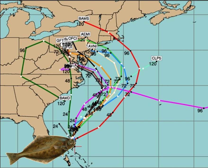 To address the complexity of the fish and fishery, the IPHC conducts an annual standardized fishery-independent longline survey, and samples the commercial fishery catch in most major ports of delivery. These data provide clear information on stock and biological trends, but they still do not tell exactly how many halibut are swimming in the Pacific Ocean. To estimate population sizes, stock assessments are needed, which means fitting models to the available data. The IPHC has done this each year since the 1970s, and after thirty years of hard labor, there is still no perfect Pacific halibut stock assessment model. Each year refinements have been made to address shortcomings of the previous analyses. And each year new issues appear, creating instability in stock size estimates, and ultimately in the stakeholders’ confidence that the science is reliable. This is where fisheries scientists have something to learn from hurricane forecasters.