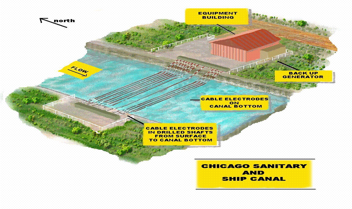Schematic of electric barrier in Chicago Sanitary and Ship Canal. (Source: prairierivers.org)