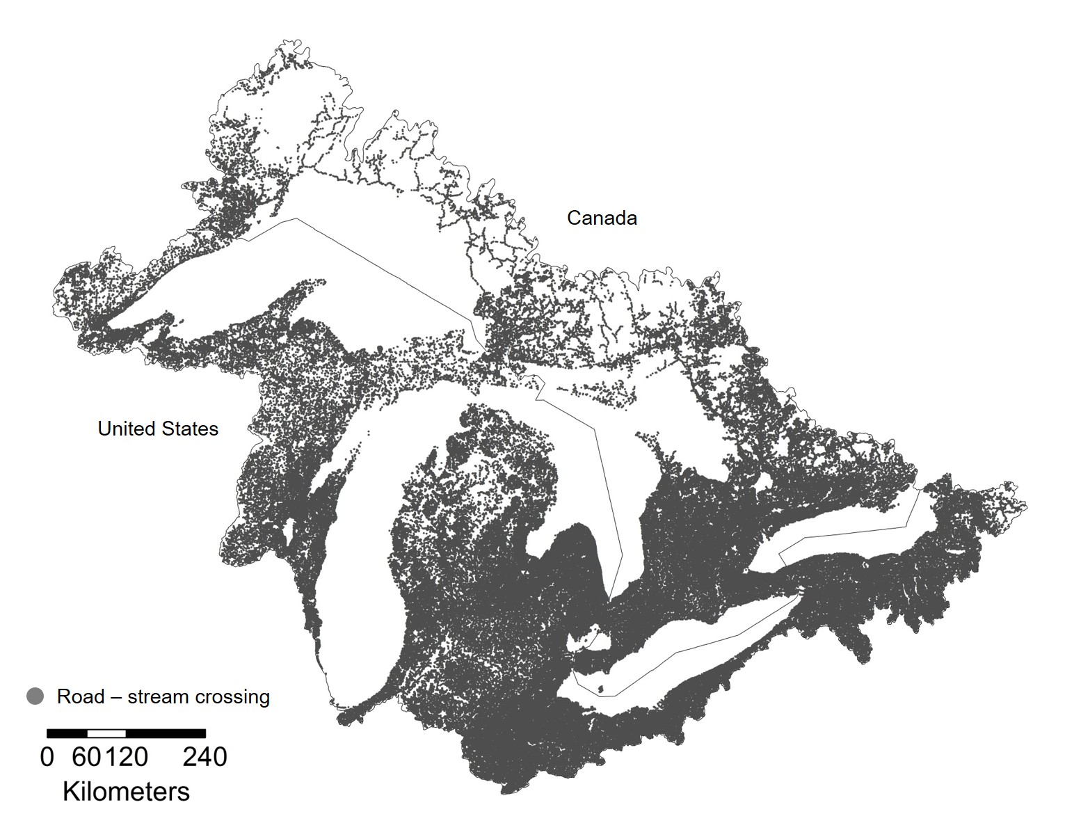 There are likely to be hundreds of thousands to even millions of road culverts that occur on small streams and rivers across the globe. In the Laurentian Great Lakes, we documented some 250,000 road – stream crossings that could support a culvert that acts as potential barriers to migratory fishes (read more about it, here). The accumulation of small, but abundant barriers, like culverts, is contributing to the decline of fish numbers and impacting fish communities across the globe (imagine towns disconnected by walls that don’t allow people to move in and out).