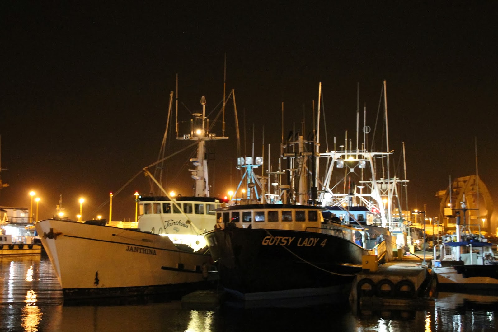 As most tourists are going to bed, Hawaiian fish processors stroll towards Pier 38 in Honolulu. The ink black Honolulu Harbor contrasts the bright lights of Waikiki Beach high-rise buildings in the distance. Despite the early hour and lack of light, one can clearly hear the sounds of people hard at work.