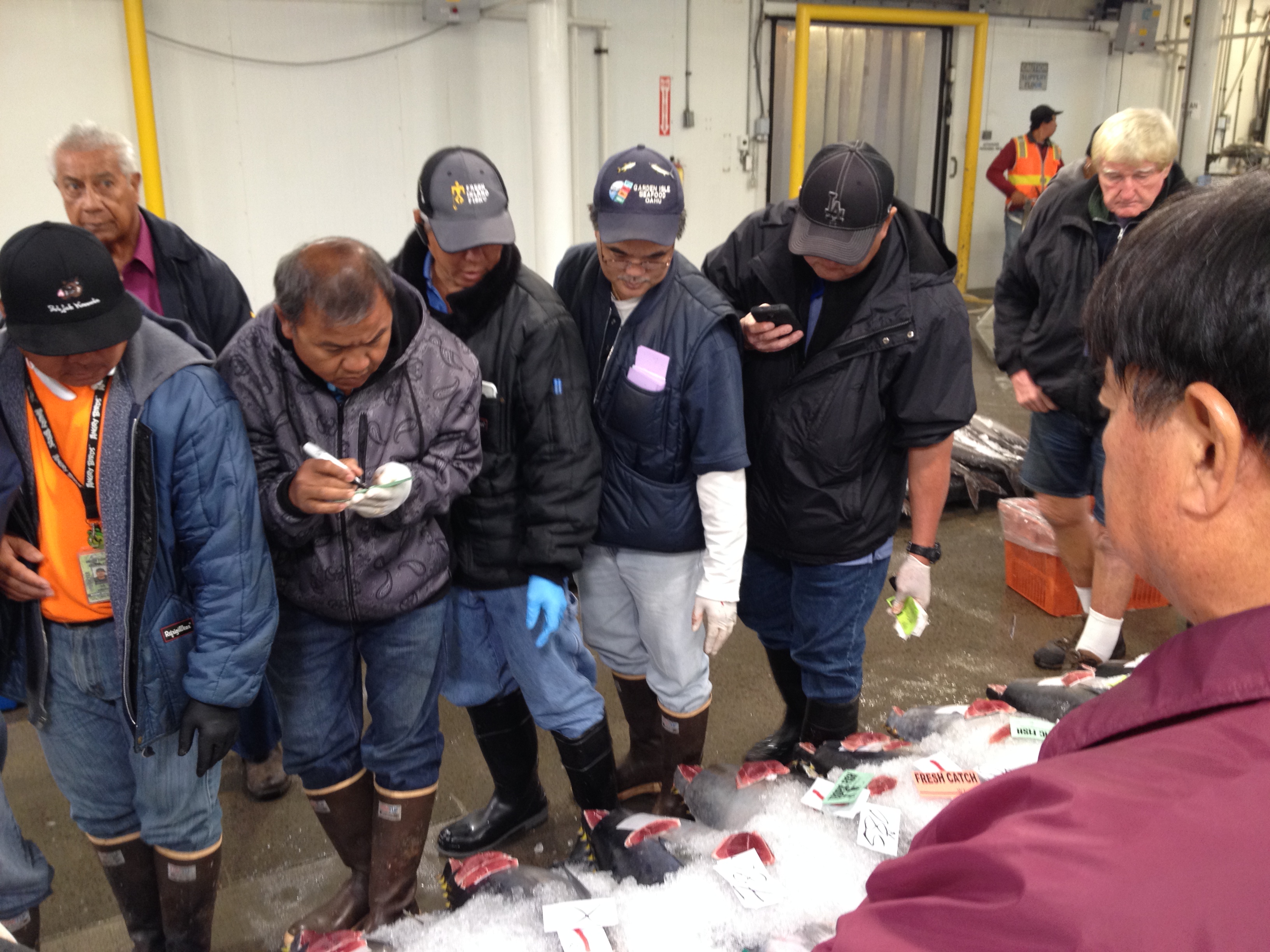 The gaggle of people play a slow game of Leap Frog down the length of the pallets of iced fish. Each individual makes a calculated move to gain the best position to evaluate the flesh of each fish while also catching the eye of the auctioneer when placing a bid. Despite the grand size of the refrigerated room, all 40 people stand touching shoulder to shoulder in a very small space. The group looked reminiscent of a bunch of small children playing soccer, where everyone wants to be as close to the ball as possible.