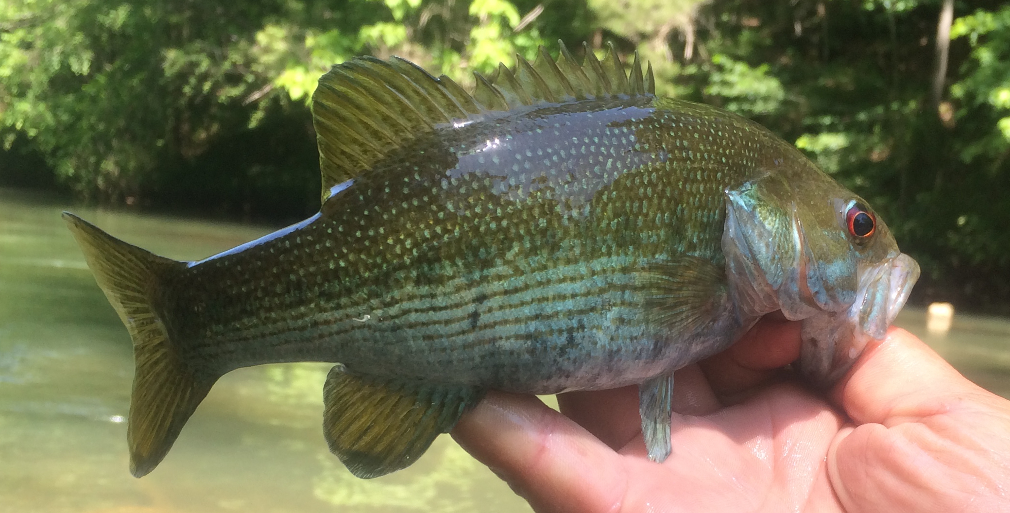 Originally, restricted to Alabama, Georgia, South Carolina, North Carolina and Tennessee.  The range occupied mostly of upland streams and rivers of the Savannah and Altamaha River basins of the Atlantic slope and the Chattahoochee, Tallapoosa, Coosa, Cahaba, and Black Warrior River basins of the Gulf slope.  Redeye’s are found in several states to the north and west (Kentucky, West Virginia, Arkansas), and also California and Puerto Rico. Redeye’s can reach 10 years but growth is much slower than other black basses.  Growth is faster in reservoirs with the world record a little over 5lbs from Lake Jocassee, South Carolina.