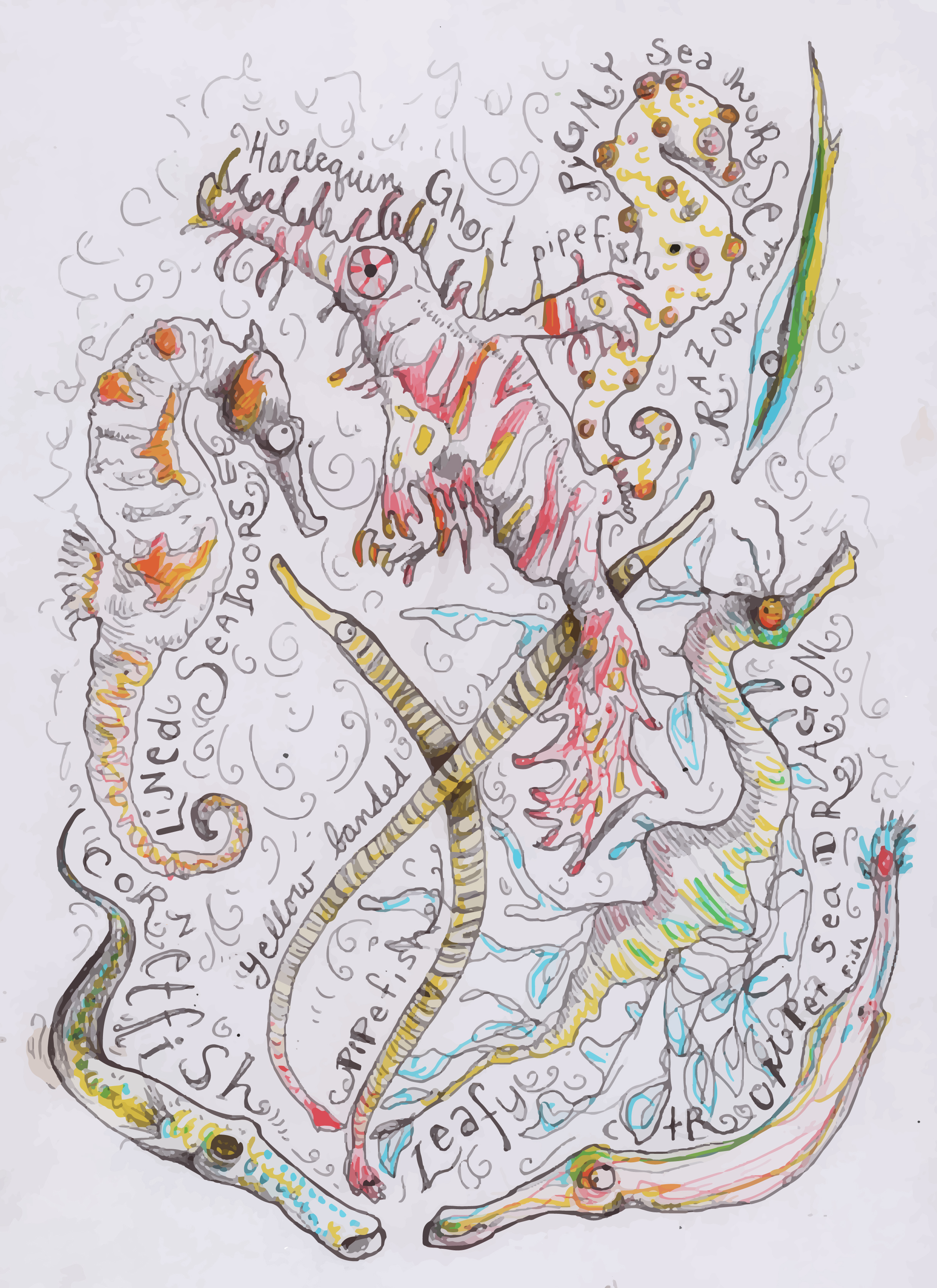 The lined seahorse serves as a good mascot and representative of the seahorses, being one of the largest seahorse species. Ironically, it is found in the western Atlantic Ocean along with two other species, including its cousin, the dwarf seahorse (Hippocampus zosterae), one of the smallest. With some exceptions, most seahorses are known for their monogamous pair bonds; with the timing of female egg production closely matching the timing of gestation of eggs in the male’s specialized brood pouch, or marsupium. This and some other species display ornate cirri, filaments resembling seaweed, as juveniles; which disappear as the individual enters adulthood. I couldn’t help but choose this fish as one of the representative seahorses, as it was the subject of my PhD dissertation. As a popular marine aquarium fish species that can be aquacultured to provide a sustainable source for the industry; I studied the impact of noise on its health/welfare in aquarium/aquaculture environments. I found that though it has relatively limited hearing ability (like many marine fishes), chronic loud noise from pumps, etc. in aquarium/aquaculture environments can still impact their health; and soundproofing retrofits are easy to make to improve aquarium environments and aquaculture operations for these and other fish species. Aquaculture presents a needed solution as an alternative to wild collection for the marine aquarium industry; as this species is listed as vulnerable on the IUCN Red List. Fortunately, it (along with other Hippocampus spp.) has been listed on Appendix II of the Convention on International Trade in Endangered Species (CITES), which regulates international trade of the genus.