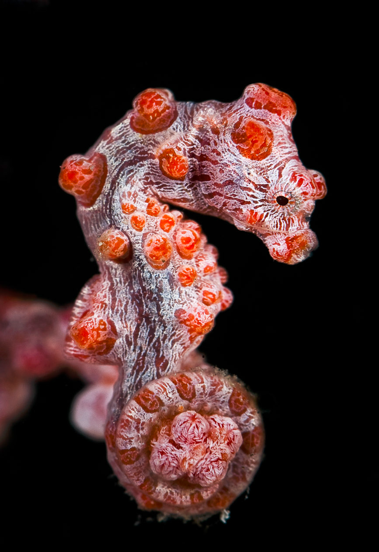 The pygmy seahorses are relatively new to science. Bargibant’s pygmy seahorse was the first to be described in 1970; the remaining six described to date weren’t named until the 2000’s. The pygmys are unique among the seahorses in that they only have a single gill opening on the back of the head (other seahorses have a pair of gill openings on either side of the head). The Bargibant’s pygmy seahorse lives exclusively in association with one genus of gorgonians (Muricella spp.), with which it has evolved masterful camouflage. This species has become a celebrity because of its photogenic nature, and made another splash in the media when highly-skilled aquarists from the California Academy of Sciences learned to successfully keep the species’ host gorgonian, and subsequently collected, mated, and reared larvae of the species in 2014. Still, though, this species is considered a “husbandry challenge,” and is best left to thrive in its natural habitat. Bargibant’s pygmy can be found throughout the Coral Triangle and eastward to tropical Japan, Vanuatu and the Great Barrier Reef.