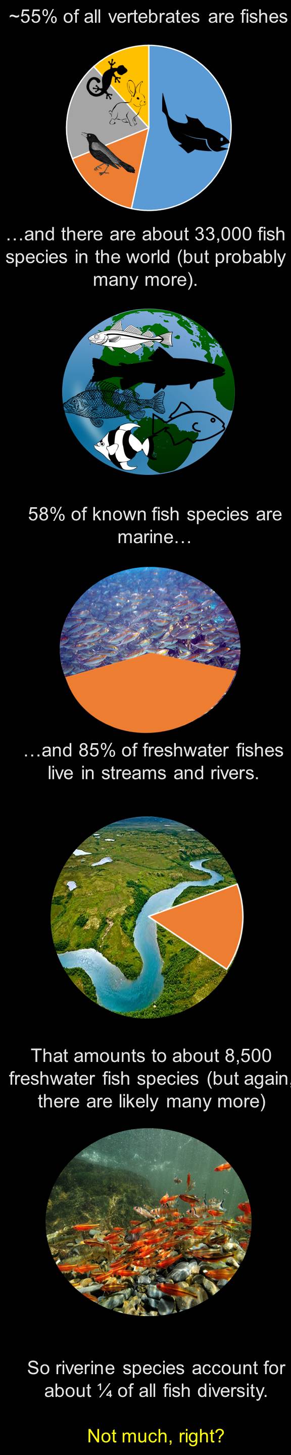 I was recently asked why I study stream and river fishes. Of course I rattled off several of the high points about threatened habitats, high biodiversity, and simply cool fish. But that question prompted me to reflect on why I do what I do, and I decided to go back to ‘square one’– the well-accepted fish conservation textbook: The Diversity of Fishes: Biology, Evolution, and Ecology by Helfman et al. (2009). In the first chapter, I came across some very interesting numbers, and I used them to make a few infographics that describe the scale and scope of freshwater fish diversity. I’ll let the numbers do the rest of the talking.