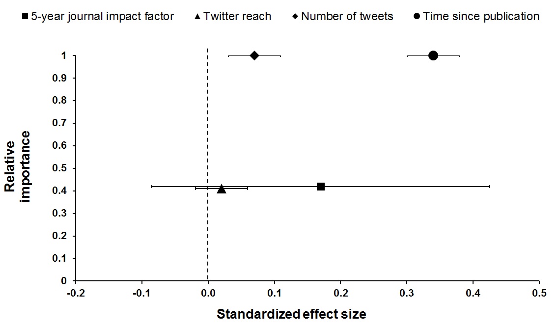Ours is certainly not the first paper to look at the relationship between social media activity and citation rates (see our full paper for a discussion). However, ours is unique in that we account for social media activity, time since publication, and journal impact factor in the same model.