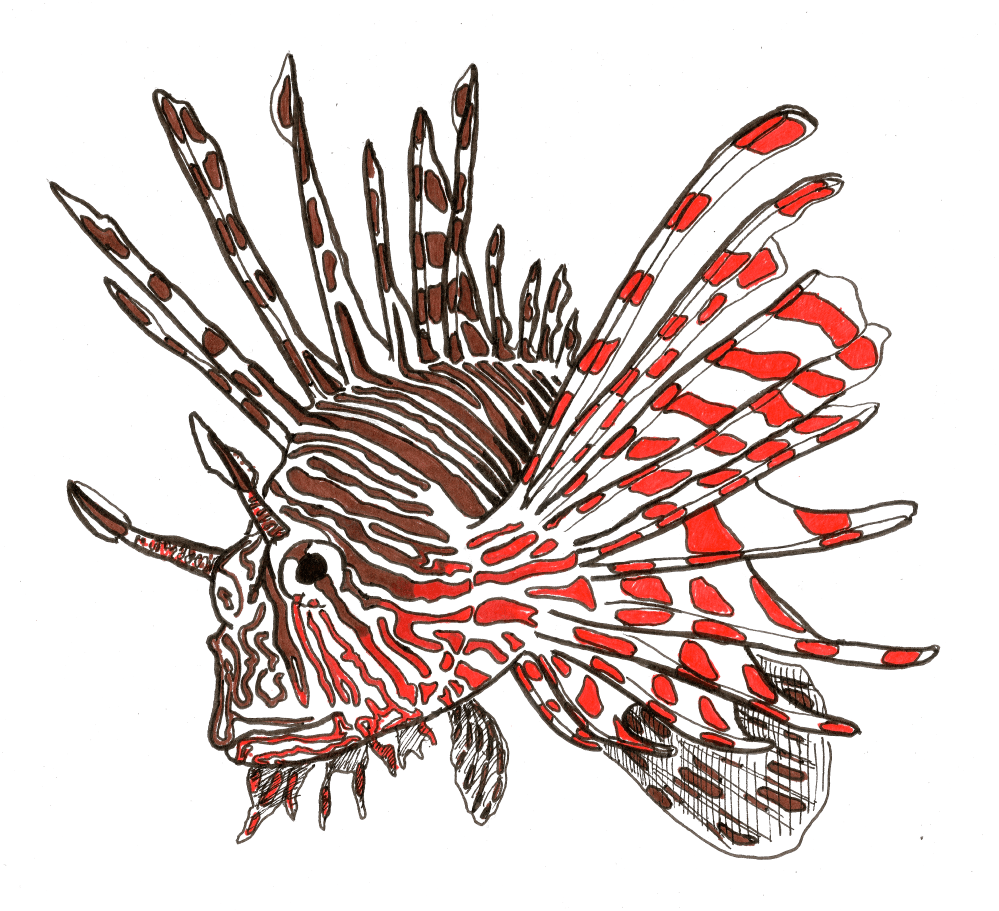 The story goes that only 6 lionfish were accidentally released into the Atlantic Ocean from an aquarium during hurricane Andrew in 1992. Genetic research supports this tale, but it is likely that many more have been intentionally released since. With no natural enemies and an extremely high reproductive rate of 2 million eggs a year from one female, they have taken over rapidly. Lionfishes have now become established in Bermuda, the Bahamas, Columbia, Cuba, the Dominican Republic, Jamaica, Puerto Rico, Turks and Caicos, and the Cayman Islands.