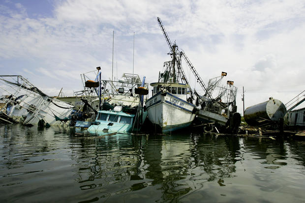 Damaged boats after Hurricane Katrina in September, 2005. Hurricane landfall was home to 15 major fishing ports, 117 seafood-processing facilities and over 14,000 fishing boats, according to FoodandWaterWatch.org. This area constitutes the third biggest seafood port in the U.S. by weight. Credit:Radhika Chalasani.  Source