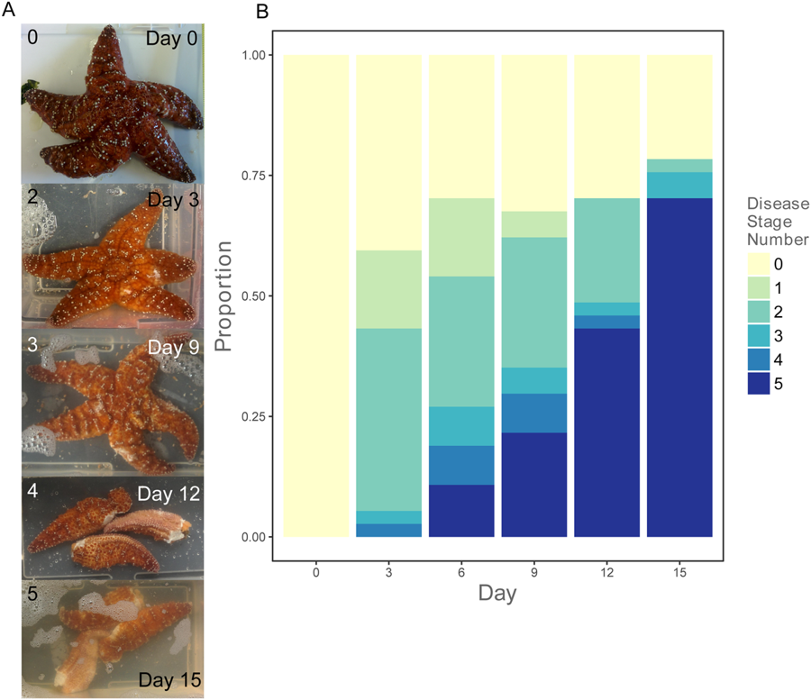 Sea Star Wasting Disease progression through a two-week experiment. (A) Photographs taken from one purple sea star as it progressed through the disease. (B) Proportion of the 37 individuals of each symptom number at the six sampling time points. Source Lloyd and Pespeni 2018: