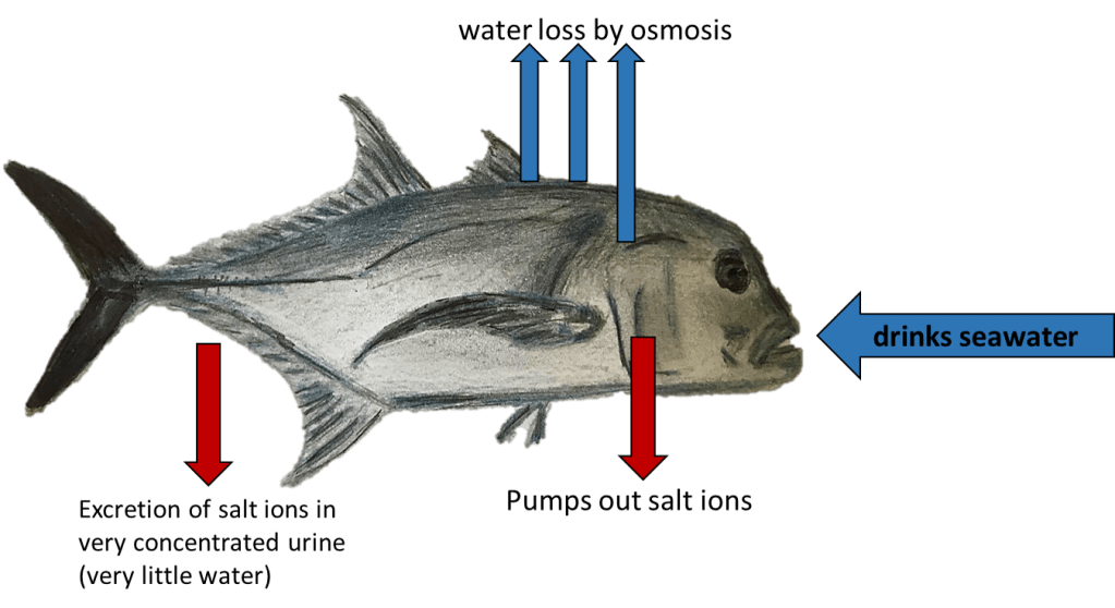 So how can a fish help in this situation? The answer lies with osmosis. Osmosis is a process that most people first learn about in school. This process occurs when water flows across a semi-permeable barrier (meaning some things can pass through it) from an area of low concentration to an area of high concentration in an effort to balance the concentration in the two areas. Osmosis poses a significant issue for fish because it is constantly trying to balance the internal fluids of fish with their surrounding environment. This means that for freshwater fish, which are saltier than the surrounding water, the freshwater around them is constantly passing into their body to dilute them to match the outside environment. On the other hand, saltwater fish are constantly losing water from their tissues as osmosis tries to make their internal fluids just as salty as the saltier water around them. The methods and energy fish use to prevent their bodies from either bursting with water or shriveling up like a raisin is called osmoregulation.