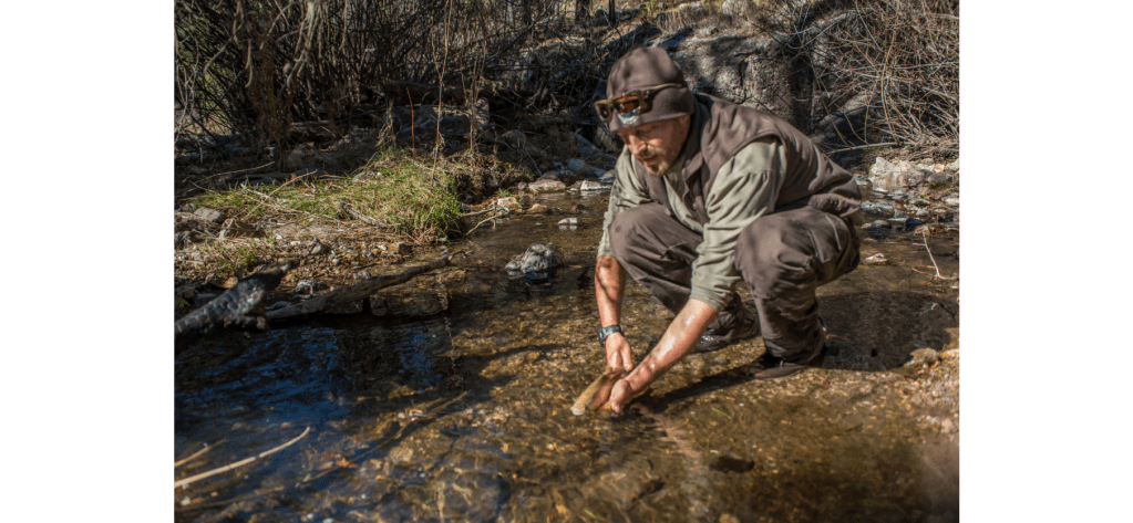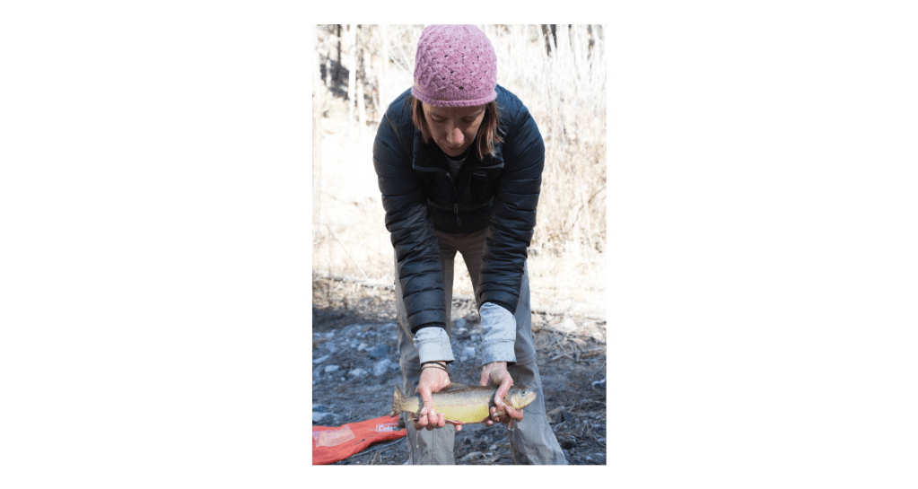 Eventually, Wick and company made their way to a primitive old Forest Service cabin on a ridge at the head of the deceptively-named Big Dry Creek, where they spent the night. At dawn, as the first rays of sunlight streamed through the forest canopy, they hiked down to the water and dispersed across the stream, sporting waders and electrofishing gear. Before long, fish, temporarily stunned, began to float sideways to the surface, exposing iridescent gold sides.