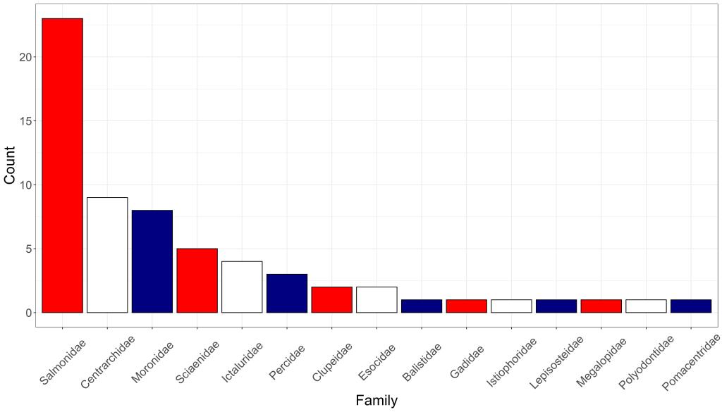 From sea to shining sea – and all the waters in between – North America is a land of high fish species diversity (Burkhead 2012). That diversity is not totally reflected in the species chosen by legislators to represent the various states and provinces, however! Of the 63 U.S. species, 23 are members of the family Salmonidae, with the single most common state species overall being the Brook Trout (Salvelinus fontinalis). And then it’s all about that bass – while the family Centrarchidae comes in as the second-most common family due to many states claiming the Largemouth Bass (Micropterus salmoides), the second most numerous species is the Striped Bass (Morone saxatilis, family Moronidae) which also was proposed as the national fish in Congress back in 2015.