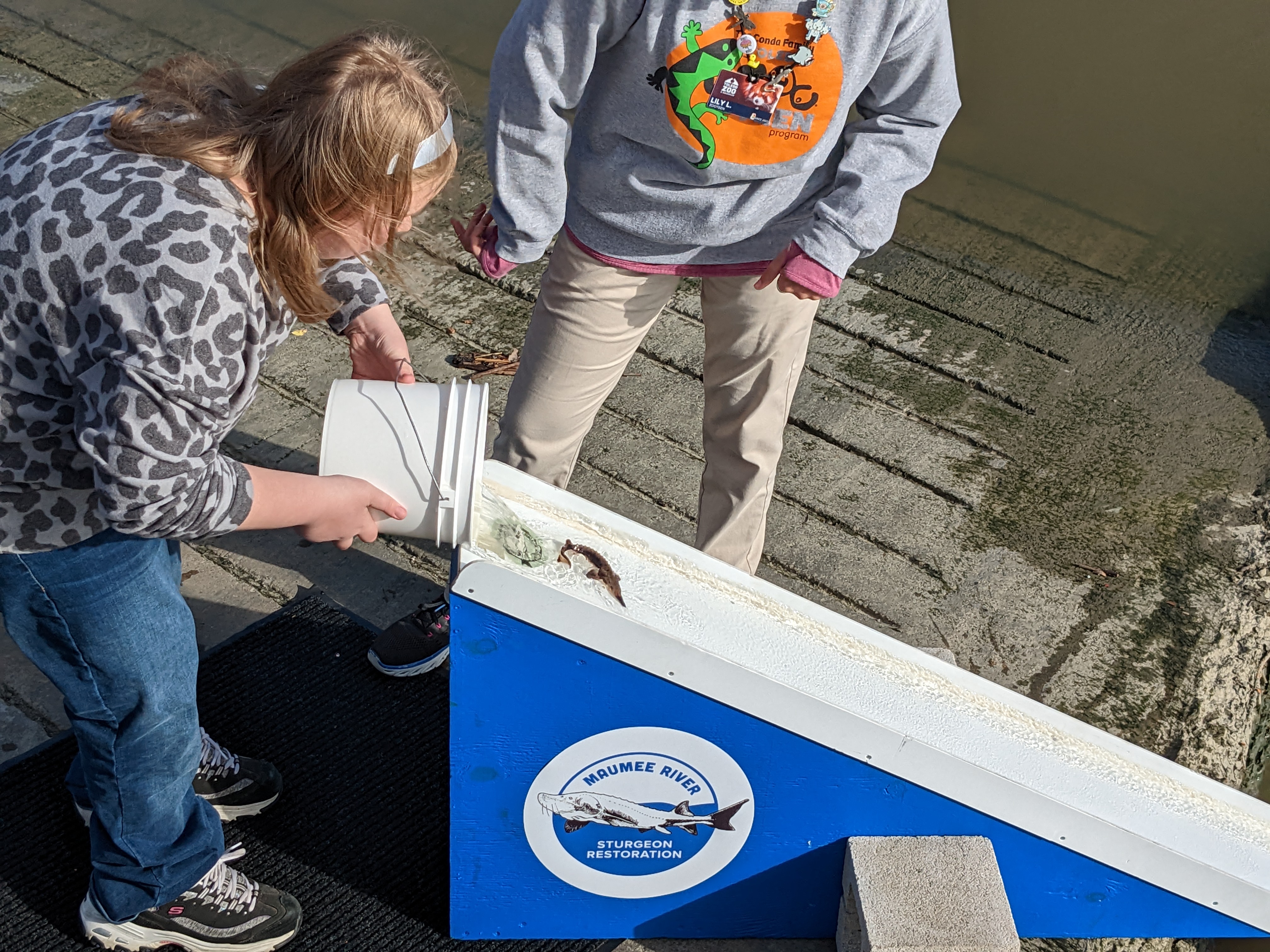 From there, non-sturgeon species that are unintentionally captured are sorted out and released back downstream. Lake Sturgeon are inspected for injuries or disease, measured, and then tagged. Sturgeon that are not ready to spawn during the next spawning period (late April to mid-May) are also released back downstream. Adult fish that are ready to spawn are loaded into a trailer and driven above a second nearby dam and released to continue their migration upstream.