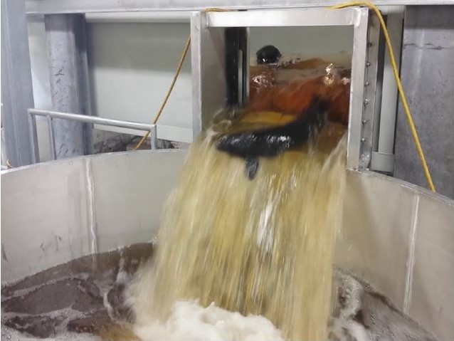 The Sturgeon Elevator is a rectangular metal hopper that can be lowered to the bottom of the river. Water from above the dam flows through the hopper area, creating a current that leads sturgeon into entering. The hopper is then lifted to the upper floor of the powerhouse and a door on the side of the hopper opens, emptying the fish into a sorting tank.