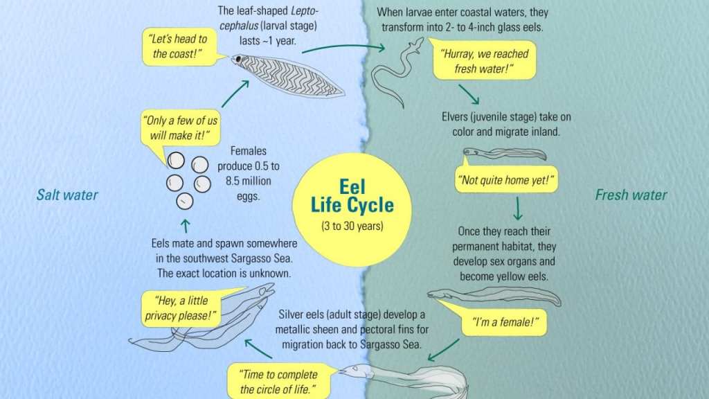 The life cycle of an American Eel involves multiple metamorphoses and migrations. Figure credit: Illustration by Eric S. Taylor, WHOI Graphic Services, with stage sketches by Salvor Gissurardottir (https://www.whoi.edu/oceanus/feature/a-slithery-ocean-mystery/)