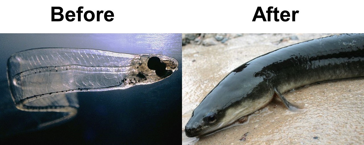 You can think of American Eels as basically reverse salmon – instead of spawning in freshwater and moving to the ocean as an adult, they spawn in the ocean (the Sargasso Sea) and spend adult life in freshwater (a lifestyle called catadromy). American Eels undergo multiple metamorphoses throughout their lives involving morphological and physiological changes that help them with their long-distance migrations across very different habitats. As marine-living, leaf-shaped larvae called leptocephali, they undergo transformations that allow them to live in freshwater habitats, becoming glass eels and eventually elvers. When it comes time to spawn, however, they undergo different transformations that allow them to return to marine habitats to spawn (i.e., the yellow and silver eel stages).