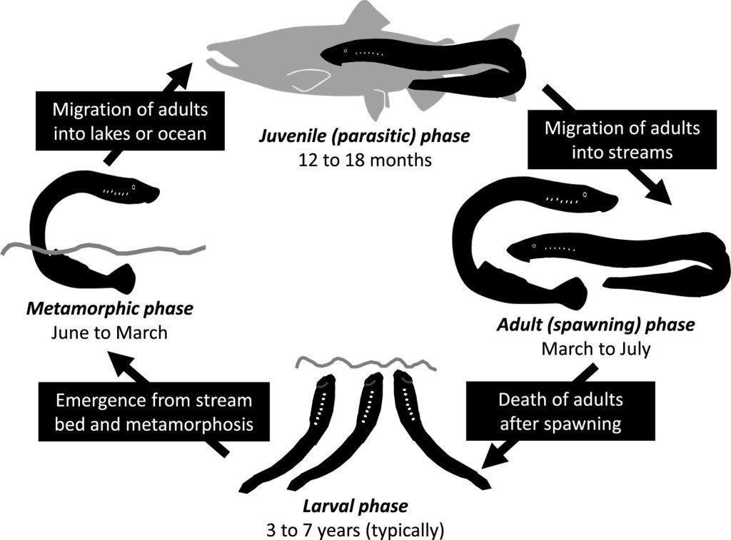 Lamprey ammocoetes begin metamorphosis when (1) water temperatures increase in the spring, and (2) when they’ve accumulate sufficient lipid reserves because they don’t eat while they’re metamorphosing (a process that can take a few months) (Dawson et al. 2015). During metamorphosis, they develop eyes, an oral disk mouth covered in pointy, hooked teeth, and a tongue covered with bony plates. They then migrate out of their natal stream and into the lake or ocean where they attach to and feed on hosts using their oral disk and teeth. This parasitic stage only lasts for 12-18 months, compared to the much-longer filter-feeding larval stage.