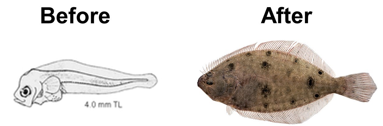 When it comes to amazing fish metamorphoses, flatfish species such as Summer Flounder (Paralichthys dentatus) undergo some of the most well-known transformations. While they start life as larvae that look “normal” (i.e., a fish with an eye on each side of the head) they end up as adults that look like they got run over by a steamroller (and have both eyes on the same side of the head). Summer Flounder larvae are planktonic and develop offshore before using currents to enter estuaries where they undergo metamorphosis to become bottom-dwellers (“benthic”).