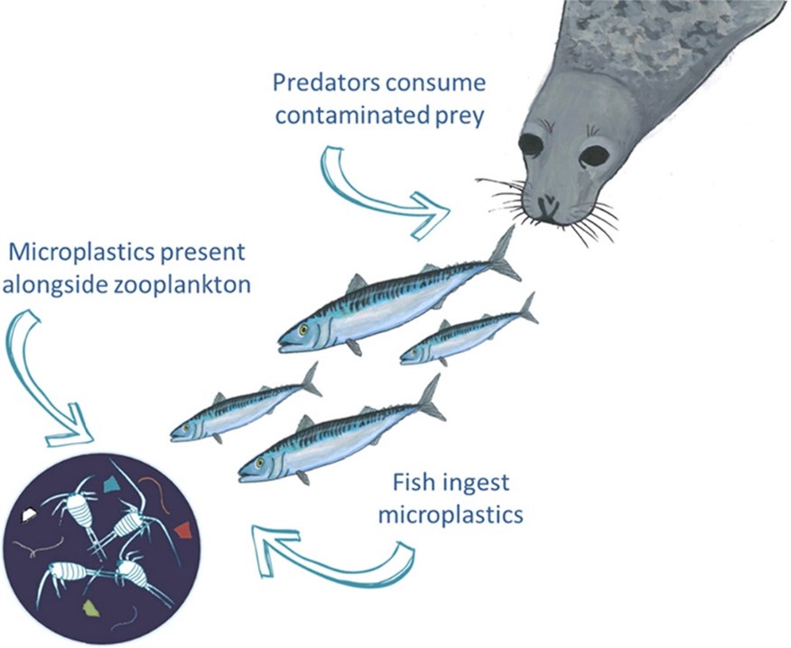 A 2019 study found six different colors of plastic in scat samples from grey seals in Skomer Island, Wales. Blue plastic was the most prevalent in 53% of samples. The grey seals may have picked up microplastics from eating flounder and cod fish. Those types of fish are known to have microplastics in their stomachs. This is where the biomagnification mentioned early comes into play—small fish eat microplastic thinking it’s a small plankton, which get eaten by a larger fish, and then the larger fish is captured and eaten by a grey seal. It’s simple addition really, the seal may eat four fish which ate ten pieces of microplastic each, so the seal ingests forty microplastics in one feeding. Some microplastic may accumulate and cause blockage which could ultimately lead to sickness or death of the seal.
