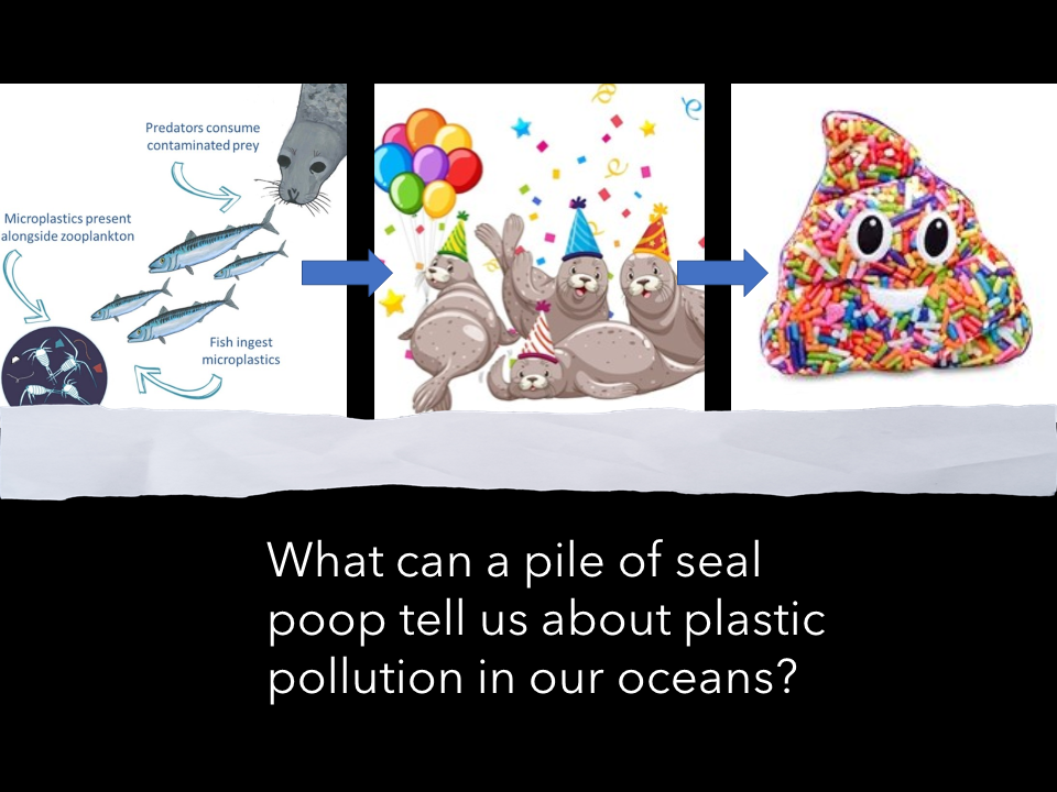 Yes, I am asking you to think about a pile of poop coated with small pieces of shiny colored bits. Wouldn’t that be odd to see? If you were a researcher studying the effects of microplastics on marine mammals, maybe not. Microplastics are very abundant in marine ecosystems. Animals within those ecosystems can ingest microplastics as they feed. If this happens, animals are not capable of digesting the plastic, and it will come out with their poop or what researchers call “scat”. So, it may look like a seal had a birthday party!