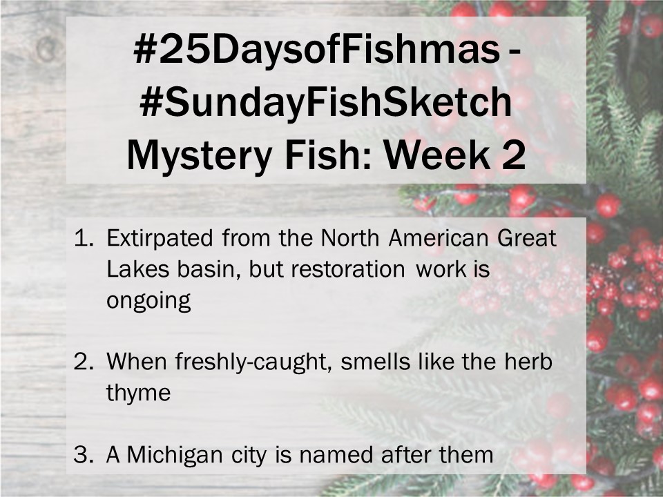 Scientists, like our own Dr. Katherine O’Reilly, have increasingly turned to social media platforms for public outreach and education on every topic under the sun. In this case, the #25DaysofFishmas hashtag aims to showcase North American Great Lakes fish diversity in a fun and engaging way. Beginning in 2016, each year 25 fish species are highlighted, Advent calendar-like, with Dr O’Reilly expounding numerous morphological, ecological, and historical facts about each. Starting in 2018, the #25DaysofFishmas teamed up with the #SundayFishSketch. During December, each Friday #FishyTheme posts include clues as to what species will be highlighted on Sunday. Our artists are told to draw what fish species they believe will be highlighted and post their drawings on Sunday when Dr. O’Reilly unveils that day’s fish. If you would like to learn more about the #25DaysofFishmas, check out our previous blog post and interview with its creator.